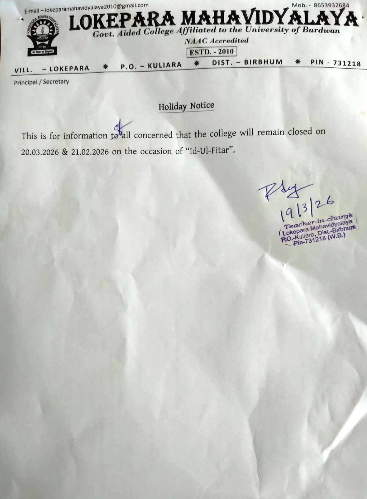 Lokepara Mahavidyalaya is located in the remote village of Bajarhat under Dheka Gram Panchayet, 23 kilometers from Sainthia. This is a new College established in 2010 with the motive of imparting higher education to the underdeveloped remote area. The idea of the college was conceived three and a half decades back. The first edifice was set up in the then Lokepara football ground by the Headmaster of Lokepara High School, Dr. Nabakishore Hazra and Sri Gopal Dutta, B.D.O of Mayureswar II. The well wishers and progressive minded people of the locality wished to establish a degree college for providing exposure for people in that locality. Remote location, economic handicap and the lack of awareness had always prevented the locals from pursuing higher studies.