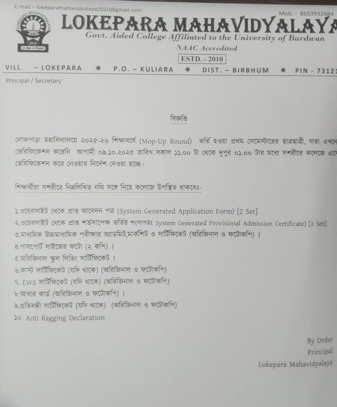 Lokepara Mahavidyalaya is located in the remote village of Bajarhat under Dheka Gram Panchayet, 23 kilometers from Sainthia. This is a new College established in 2010 with the motive of imparting higher education to the underdeveloped remote area. The idea of the college was conceived three and a half decades back. The first edifice was set up in the then Lokepara football ground by the Headmaster of Lokepara High School, Dr. Nabakishore Hazra and Sri Gopal Dutta, B.D.O of Mayureswar II. The well wishers and progressive minded people of the locality wished to establish a degree college for providing exposure for people in that locality. Remote location, economic handicap and the lack of awareness had always prevented the locals from pursuing higher studies.